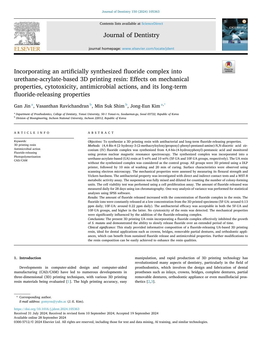 Synthesized a fluoride-releasing complex and successfully incorporated it into a urethane acrylate-based resin, demonstrating a potent anti-S. mutans effect and sustained fluoride ion release over a one-month observation period.